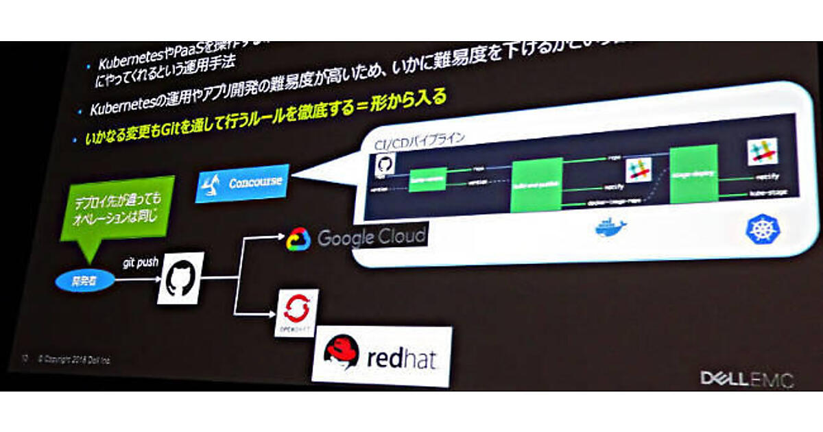 ここでのポイントは実装する先(オンプレミスまたはパブリッククラウド)が違っても、開発者にとって操作を同一にすることでデベロッパーとインフラエンジニアの労力を下げられるという点だろう。GitHub、Kubernetes、OpenShift、Docker、Weaveworksなどに混じって、さり気なくConcourseも挙げられていた。CI/CDのツールとしてPivotalがCloud Foundryの開発に使っているConcourseが挙げられているというのは、いかにもという感じだ。