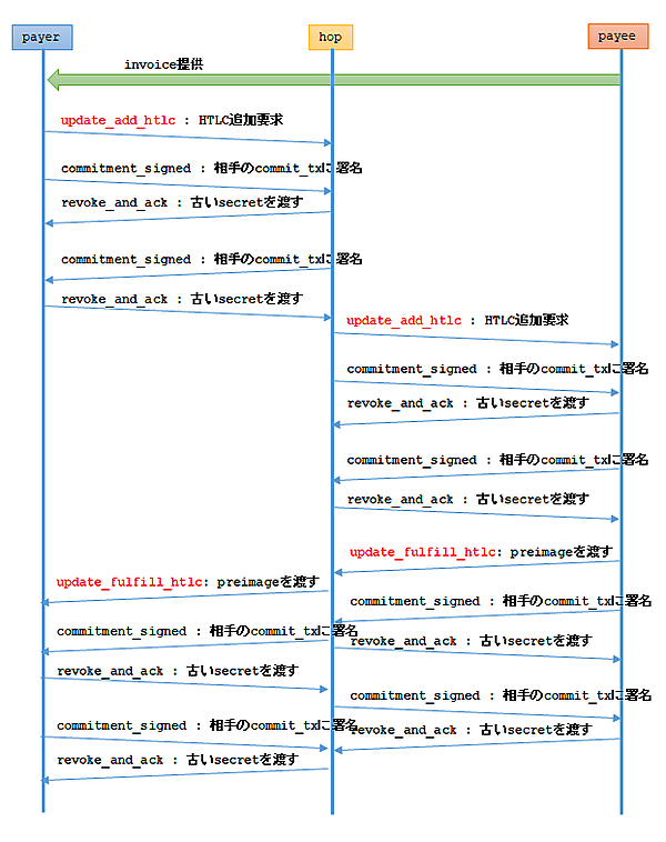 送金者(payer)が送金先(payee)からinvoiceをもらうところはLightning Networkメッセージではなく、それ以外のルートで行っています(前回の記事参照)。update_add_htlc~commitment_signed~revoke_and_ackによりpayeeにHTLCが追加され、次のcommitment_signed~revoke_and_ackでpayerにHTLCが追加されます。
