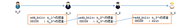 送金を開始するLightning Networkメッセージはupdate_add_htlcという名前ですが、そのパラメータに「相手への送金情報(非onion)」と「相手が復号すると次の転送先への送金情報がわかるデータ(onion)」を付けて送ります。そうすることで、update_add_htlcを受信した人は転送先だけの送金情報しかわからないことになります。最終的な送金先がonionデータを復号すると、次の送金先がないため自分への送金であることがわかります。