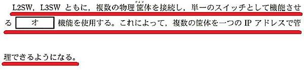 監視システム上のマップを完成させる問題です。12ページ下から1~2行目と13ページ上から1行目の記述にある通り、L2SWやL3SWはスタック機能により1台として扱っています(図10)。実際、問題文中の図3では物理的に2台あるL2SWとL3SWの筐体を1台で描いています。また、13ページ上から5~6行目の記述より、問題文中の図3で表現する対象は問題文中の図1のNW基盤であることがわかります(図11)。NW基盤には監視サーバや大型コンピュータ、顧客システムは含まれていません。そこで、問題文中の図1にある3階と4階のL2SWを記入すれば解答となります(図12)。