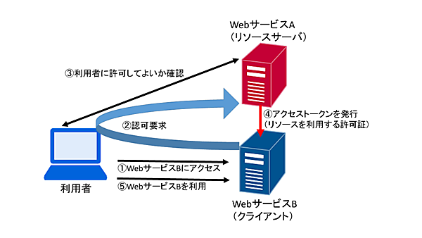 問題文より、利用者のリソースを持つサーバがWebサービスAです。OAuthではこのサーバをリソースサーバと呼びます。利用者が利用したいサービスはWebサービスBにあります。このサーバをクライアントと呼びます。ただし、利用者がWebサービスBのサービスを利用するには認可が必要です。WebサービスBは利用者のリソースを持たないので、WebサービスAから利用者のリソースを借り受ける必要があります。