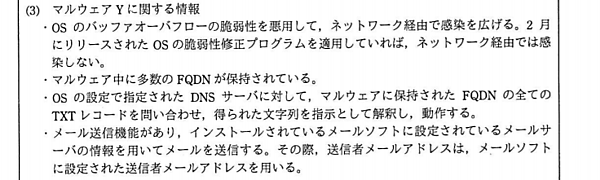 P23の下線部①付近の文章に、「マルウェアYは, C&Cサーバから指示を受け取ります。マルウェアYと同様のタイプのマルウェアに感染した場合に備えて, ①外部サーバDNSサーバと内部DNSサーバのDNS問合せに関する設定を変更してください。」とあります。