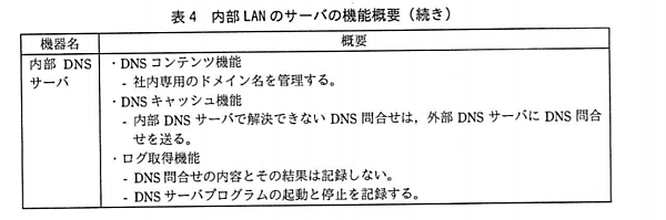 | 外部DNSサーバの設定変更の内容 | 内部DNSサーバからのDNS問合せを拒否する。 |