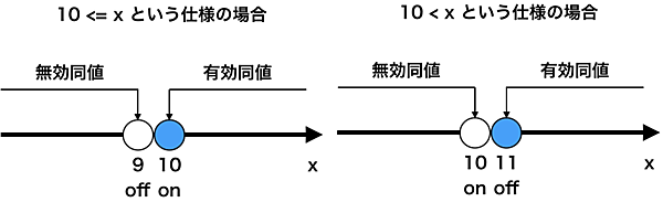 境界値分析を行って導いた境界値に基づいてテストケースを設計します。境界値分析で選択する境界値を「ONポイント」「OFFポイント」と言います。