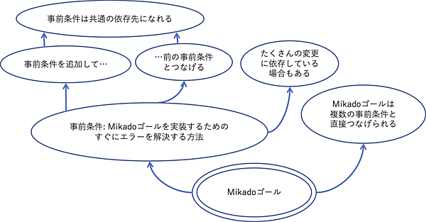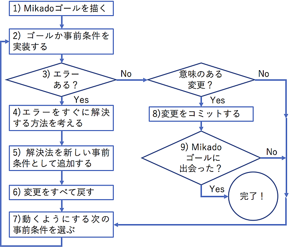 - Mikadoゴールに辿りつけば完成。そうでなければ別の事前条件に着手する。これを繰り返す