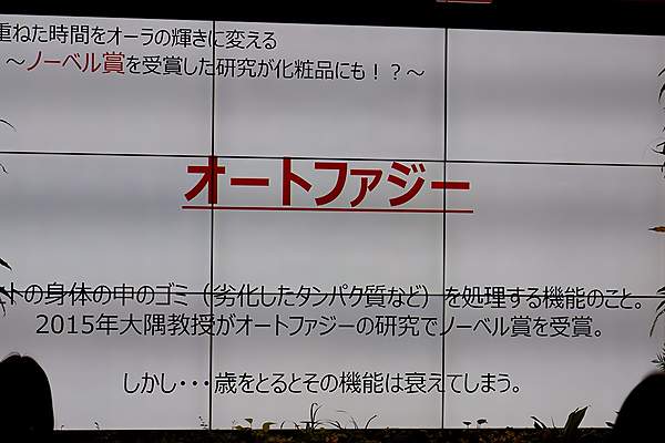 さらには「肌×声」というテーマで、普段は「ママ」や「お母さん」と呼ばれることが多い女性が「ファーストネーム」で呼ばれたときに、美のホルモン「オキシトシン」が増え、ホルモンを良好な状態に導くことを発見。「肌×ノーベル賞」というテーマでは、ノーベル賞を受賞したオートファジー(体の中のゴミを処理する機能)研究をエイジングケアに活かす努力などが紹介されました。