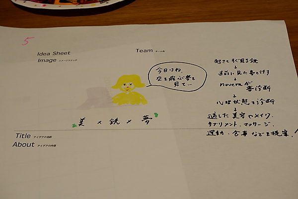 ちなみに、私のチームでは、私が出した「美容×夢」というキーワードをもとに、鏡は朝見るから、朝起きたときに直前に見た夢を診断して、その夢から心理状態を分析、ビューティーアドバイスをしてくれる機能」を発表しました。