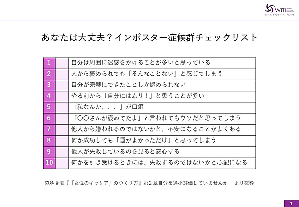 「インポスター症候群」とは、褒められても自信が持てず、自分を過小評価してしまうこと。女性に多く見られ、例えば、男性は50%くらいできそうであれば「やります」と言うのに対し、女性、特にインポスター症候群の人は120%自信がないと「やります」と言いません。自信がなく「やります」と言えないため、新しいことに挑戦しにくくなってしまうのです。そこで、自分にインボスター症候群の兆候がないか、10の質問に答えて判断する「インポスター症候群チェック」が行われました。