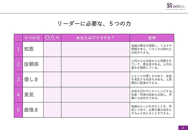 各自が自分の傾向を把握したところで、次に「リーダーに必要な5つの力」チェックを行いました。知恵・信頼感・優しさ・勇気・厳格さの5つについて、それぞれ〇△×をつけます。客観的に自分の傾向を把握することで、どんなリーダーシップが適しているかが判断しやすくなります。