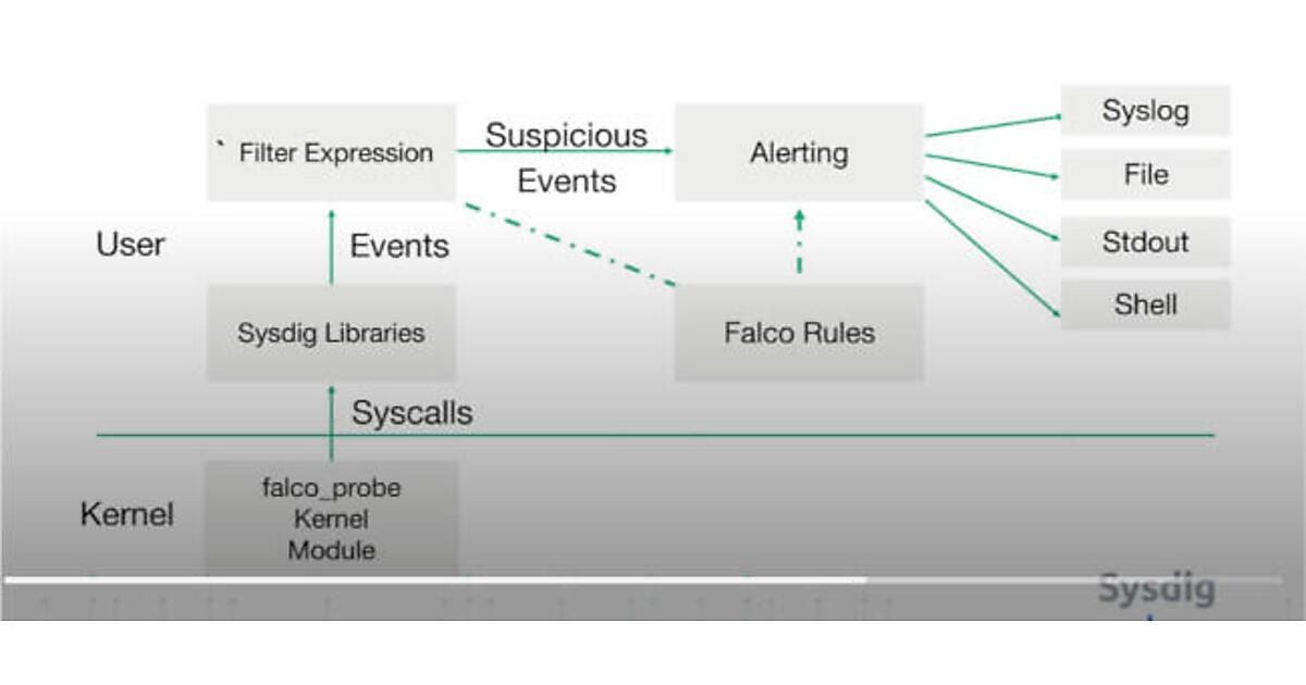 Falcoはユーザースペースで稼働するプロセスだが、システムコールをフックするモジュールだけはカーネルモードで実行され、Sysdigのライブラリーを経て先に挙げたルールを評価して合致したものがアラートを担当するモジュールに渡され、最終的にログやファイル、その他のアプリケーションに渡されることになる。