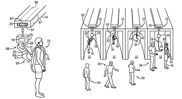 出願書には2種類のVR/AR体験システムが掲載されています。1つは、VR/ARヘッドセットと利用者が身につけるハーネスによって構成されます。ハーネスは、VR体験施設の天井部分から伸びたケーブルによって、施設側と有線接続されており、所定の動作(前後移動等)以外の利用者の動きを、制限する仕組みとなっています。