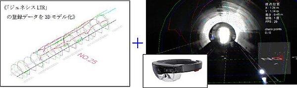 「MOLE-FMR」は、同社のトンネル補修工事データベース「ジェネシスLTR」に管理されている調査記録や点検記録、施工・補修履歴情報を元に、3Dモデル自動で生成します。HoloLensを活用し、現実空間に補修履歴や記録を3D画像表示させて、リアルタイムに現状と比較できるシステムです。