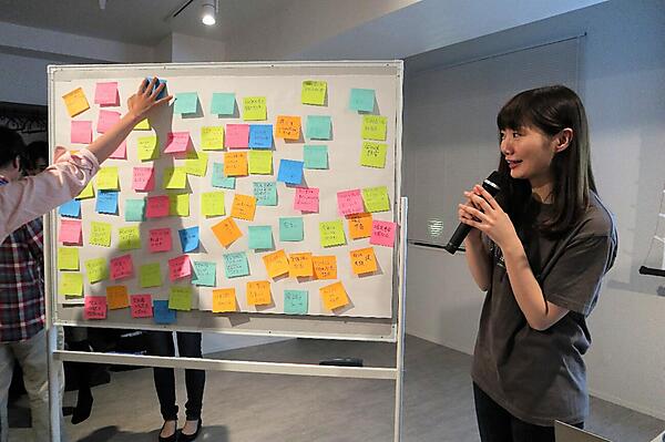 そして、一人ひとりがアイディアを書いた付箋をホワイトボードに貼っていき、新宿・渋谷コミュニティマネージャーの田中さやかさんはじめとする運営メンバーらが気になった意見を発表した。