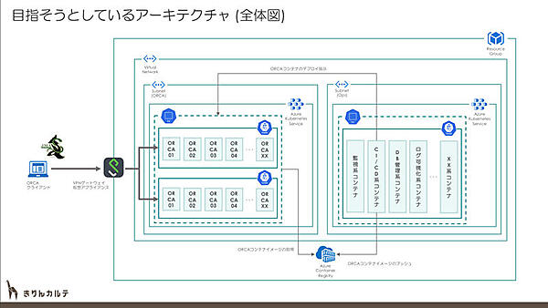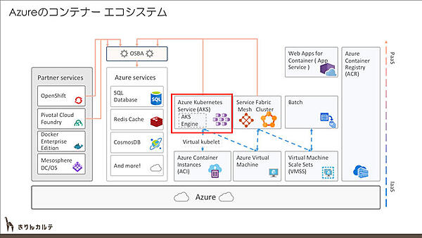同社が利用しているAzureサービス群の中で、コンテナ化のキーとなるのはAzure Kubernetes Service (以降、AKS)とAzure Container Instances(以降、ACI)の2つ。AKSは容易にコンテナのデプロイとスケーリングを実現する。ACIは単独のコンテナを必要なタイミングでインスタンスとして利用できる。Virtual Kubeletを使用することで、AKSの一部としてACIを利用することも可能だ。