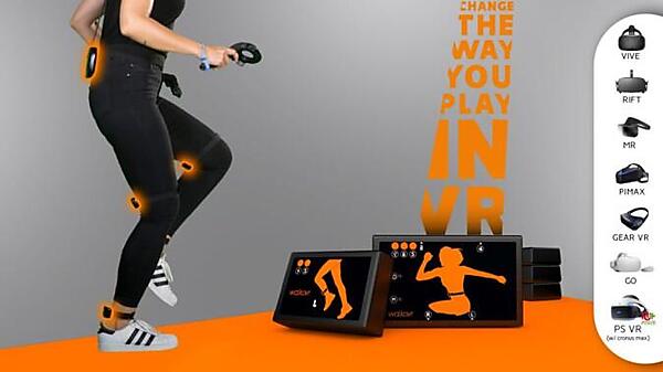 「WalkOVR」は、下半身に複数のセンサーユニットを装着することで機能するデバイスです。センサーは腰に1つ、両脚に4つ(片脚に2つずつ)の計5つを取りつけます。これらのセンサーユニットが複合して機能することで、モーションキャプチャー用スーツのような働きを生み出し、利用者の動きをゲーム内に伝達します。