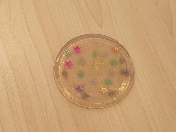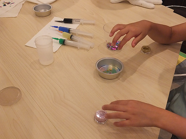 ワークショップの工程は、まず容器の中にαGELを流し込み、模様を描いたり、好きな色を付けたりしていく。次にホットプレートの上に置いて固めたら、その上にまたαGELを乗せて複層。もう1度ホットプレートで温めたら容器から外し、最後に冷水の中に入れゲルが固まるのを待って完成。αGELの耐熱温度は100度以上なため、熱いものをそのままおいても大丈夫とのこと。参加した子ども達は、思い思いのコースターを作っていた。