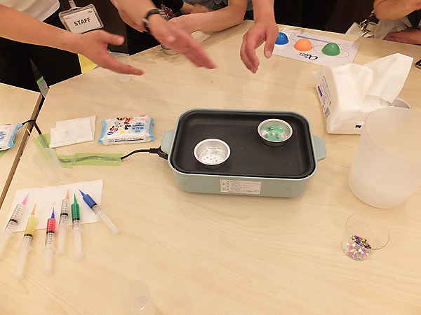 なお、毎週土曜日には週替わりでワークショップを実施。5月18日は株式会社タイカの「αGEL(アルファゲル)を使ったコースター作り」のワークショップが開催された。同ワークショップは13時~と15時~の2部があり、多くの親子連れが参加していた。