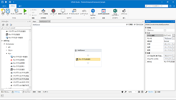 前述の通りUiPathでは、キューアイテムを作成するための部品がUiPath Studioのアクティビティとして用意されています。このアクティビティを使用してキューアイテムを作成します。