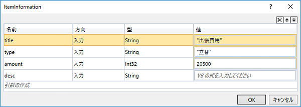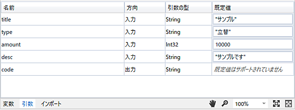 あらかじめ、入力となるインプットの引数を既定値(デフォルト値)付きで下記の通りに作成しておきます。このワークフロー自体を実行すると、既定値を使用して経費デモサイトの自動化が正しく行われるかどうかをワークフロー単体で確認できます。