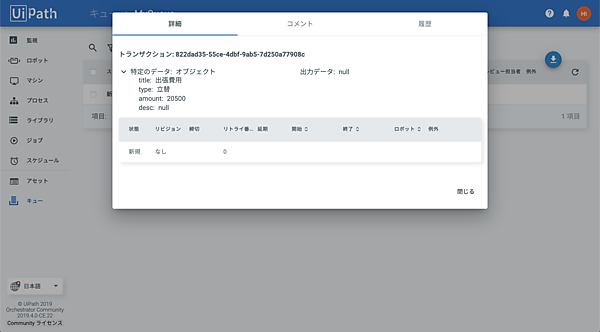 問題なく実行できたことを確認し、OrchestratorのWebコンソールで、キューアイテムが次のように作成されていることを確認します。