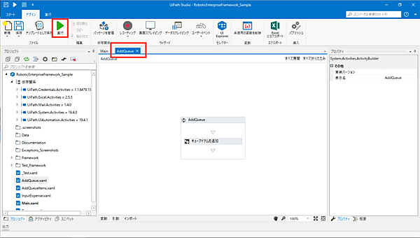 早速こちらのワークフローを「実行」ボタンより実行します。ワークフロー単体での実行は、「AddQueue.xaml」が選択された状態で、UiPath Studioの「実行」ボタンを押すことで可能です。