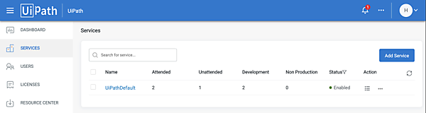 「Service」のメニューへ遷移するとデフォルトで、「UiPathDefault」というOrchestratorのテナントが存在しています。