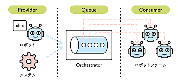 提供側は、キュー機能に対して自動化処理されるための情報をキューアイテムとして登録します。キューアイテムの登録にはロボットも使えますし、トランザクション生成元のシステムからOrchestratorのAPIを使用して直接登録することも可能です。