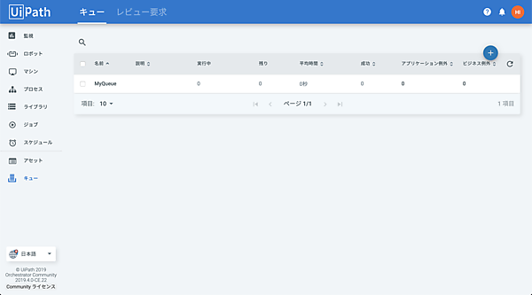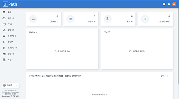 「UiPathDefault」をクリックし、Orchestratorを開きます。ここからOrchestratorの画面となります。Orchestratorは日本語に対応しており、画面左下の言語選択メニューで表示言語を日本語に変更可能です。