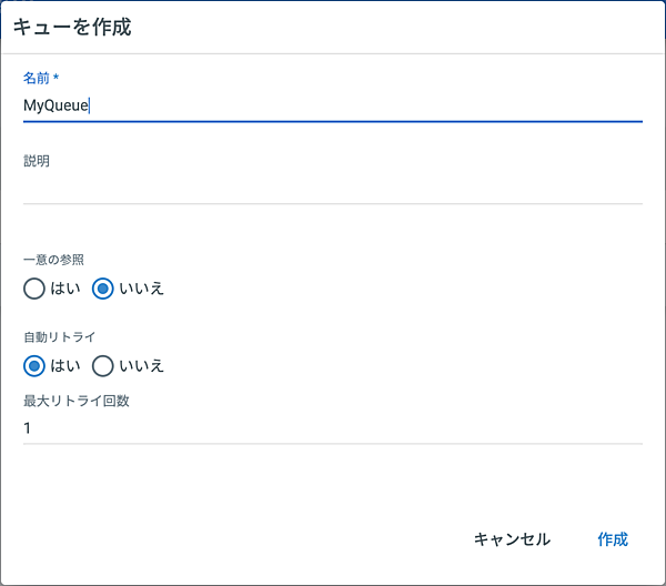 画面右側の「+」(新規作成)ボタンより、「MyQueue」という名称でキューを作成します。