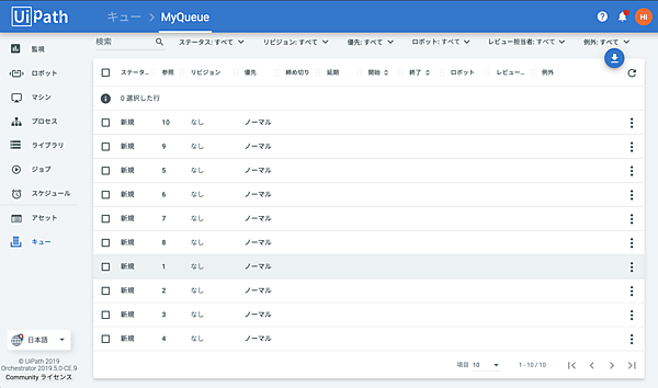 最後にこのワークフローを実行し、複数のキューアイテムが登録されていることを確認します。サンプルデータは、確認用に10件だけのデータセットです。