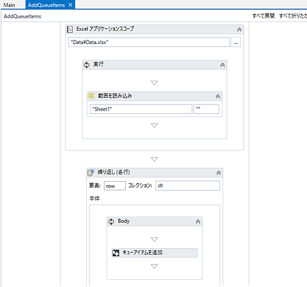 読み取った結果はDataTable型の変数dtとして保存し、「繰り返し(各行)」内で、一件ごとに「キューアイテムを追加」アクティビティにてキューアイテムとして登録します。