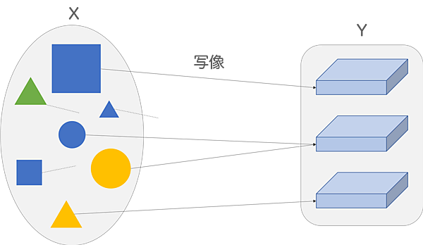 先ほどの夢の話に戻りましょう。入力は何でしょうか? 出力は何でしょうか? そして写像は何でしょうか? 入力は「積み木」ですね。出力は「この箱に入れる」という考えです。さて、それでは写像は? 簡単です。「三角形の積み木ならば、三角形用の箱に入れる」というように、全ての積み木に対してどの箱に入れるかが明確に分かるルールです。絵で描くと次のようになります。