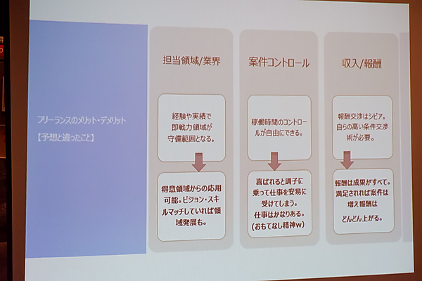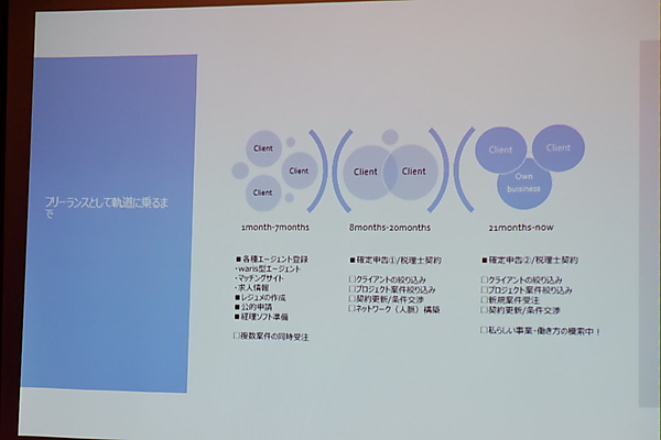 大変だったのは、会社とのコミュニケーションだ。同時進行ではないが10社ほどとやりとりしている段階で、自分のパフォーマンスを上げるためにも半年ほどで数社に絞った。自分が心掛けていたことは、契約期間を3~6ヶ月にしたこと。理由は新しい仕事へ踏み出せる環境を保持しておきたいこと、条件交渉の機会を確保するため。お互い「ここまで」というゴールが明確だったので、トラブルもなかったという。