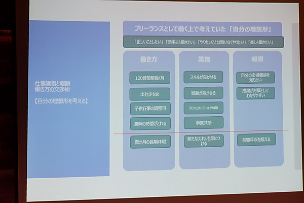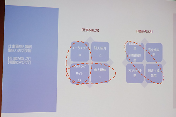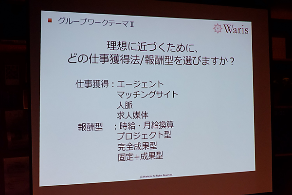 次のグループワークは、「理想に近づくために、どの仕事獲得法/報酬型を選ぶか」というテーマ。大きく「仕事獲得法」と「報酬型」に分けて考えた。人脈では「相手が知り合いのケースが多く、自分を知っていてくれることからオーバースペックの仕事にならなくて良い」「これまでの職歴により同業種など偏りがちになる」という意見があった。エージェントやマッチングサイトは自分の知らない企業との出会いなど、販路拡大に活用するのはありとの意見も。また、「SNSから仕事につながったケースもあった」という話から、「Facebookなど最近ではSNSから仕事獲得に繋がるケースも少なくない。そのためにも、自分が何をやっているどんな人なのか、外から見てわかるようにしておくことは、今後より大切になって来るだろう」という意見が出た。プロジェクトからプロジェクトへと社内で繋がっていくなど、初めは人脈でない関係から人脈へと繋がったケースもあったという。