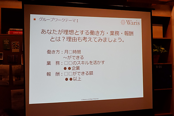菅原さんの講演後、「自分の理想とする働き方・業務・報酬とは?」というテーマでグループワークを行なった。自分の理想を働き方・業務・報酬と分けて考え、その理由を書き出し、グループ内で自分の理想とする働き方をアウトプット、各グループの意見をまとめて、代表者が発表した。働き方では、「月の半分くらい働きたい」という方や「フルタイムで働きたい」など、今のライフステージによって個々の意見が出た。業務では、「本職のスキルを活用していきたい」という方が多かった。また、半分以上の方が「前職よりも多くの報酬を得たい」と考えているようだった。