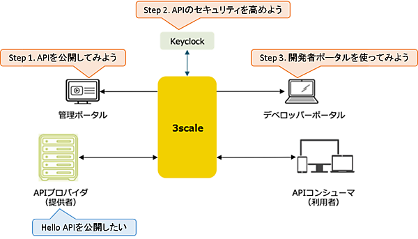 今回は、3scaleの基本的な使い方を解説します。図1のように、実際にAPIバックエンドに存在する(APIプロバイダが提供する)Hello APIを、3scaleを使って公開するというユースケース(Step 1~Step 3)に沿って解説します。