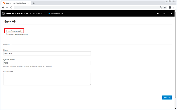 3scaleでは、手動でAPIを追加する方法と、サービスディスカバリ機能(OpenShift上にデプロイされたAPIサービスをシームレスに3scaleに取り込む機能)を用いてAPIを追加する方法があります。ここでは、手動でAPIを追加してみましょう(図3)。