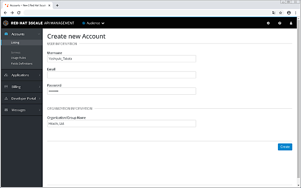 管理ポータルのダッシュボードから[Audience]→[Create]を選択し、開発者アカウントを作成します(図7)。