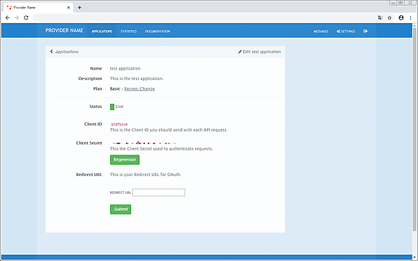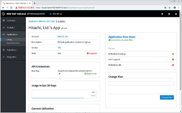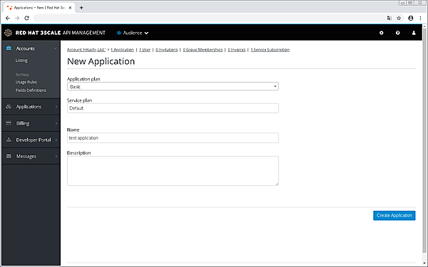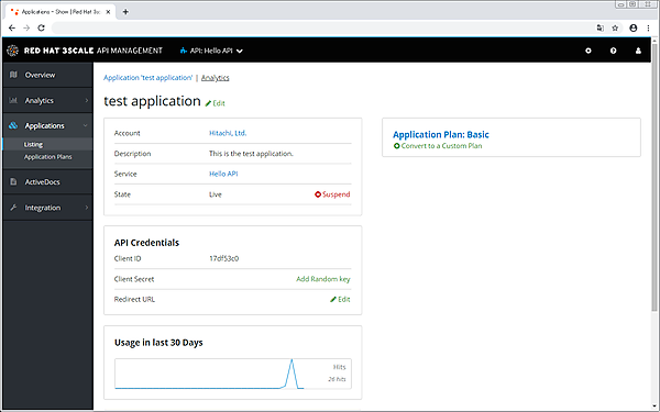 次に、新規クライアントアプリケーションを作成します(図10)。ここでは、”test application”というアプリケーションを作成します。[Application Plan]には、先ほど作成したHello APIの”Basic”アプリケーションプランを設定します。