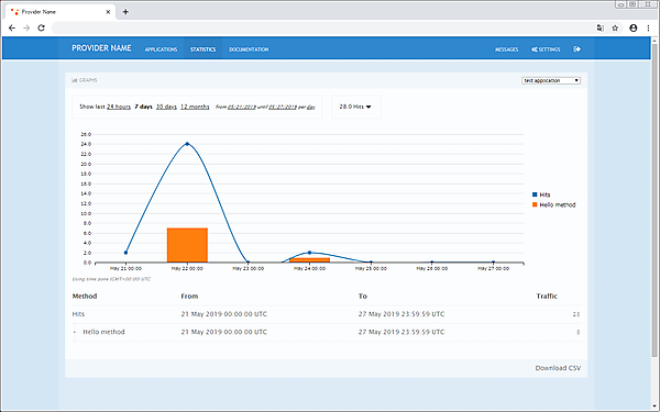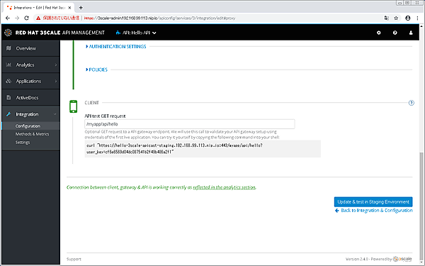 ステージング環境用のAPIゲートウェイを用いて、Hello APIをコールしてみます。”user_key”クエリには、作成したクライアントアプリケーションのAPIキーを付与します。APIキーは、クライアントアプリケーションの概要画面で確認できます。