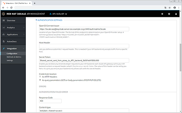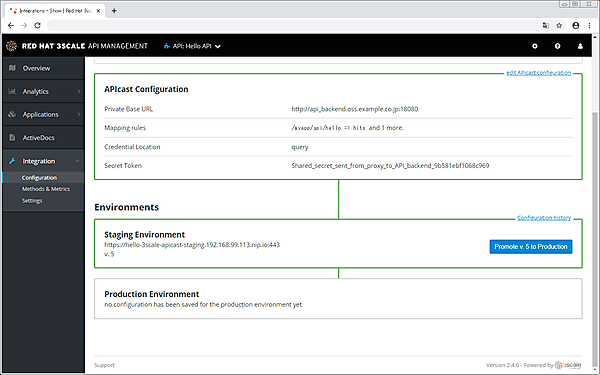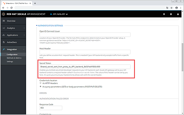 デフォルトでは、”X-3scale-proxy-secret-token”というヘッダに、” Shared_secret_sent_from_proxy_to_API_backend_<乱数>”という値が入ります。APIバックエンドで、この値をチェックする処理を作り込むことで、APIバックエンドが直接コールされるといったAPIの意図しない使われ方を防ぐことができます。