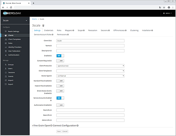 まず、Keycloakを設定します。ここでは3scaleという名前のレルムを準備します。3scaleレルムに、3scale用のクライアントを設定します(図17)。