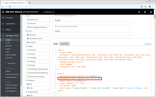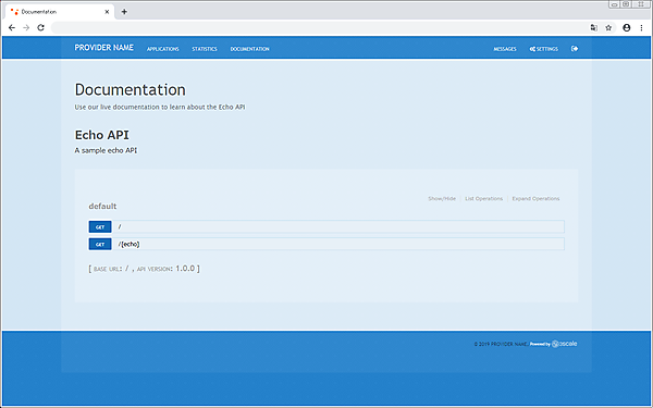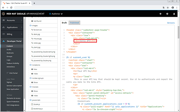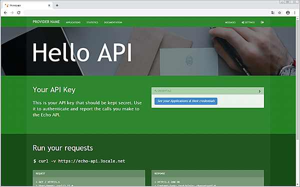 次に、開発者ポータル画面を変更していきます。まずは、トップ画面のタイトルを”Echo API”から”Hello API”に変更し、ついでに画面の背景も青色から緑色に変更しましょう。