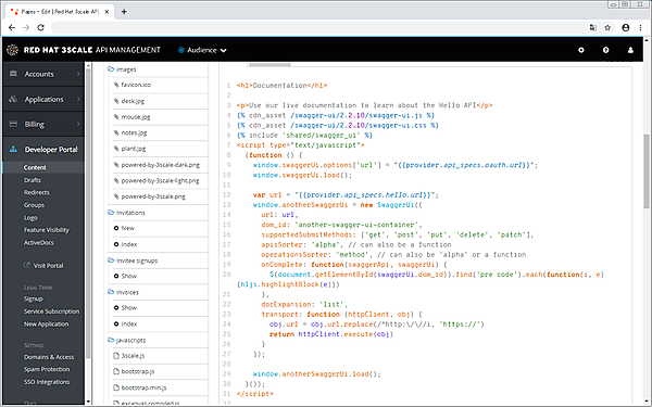 続けて、開発者ポータルのドキュメンテーションを変更します。ドキュメンテーションは[Documentation]で変更します。ここでは、アクセストークンを取得するためのAPIの仕様とHello APIの仕様を並べて表示するために、新しく”another-swagger-ui-container”というDOMを設けています(図31)。