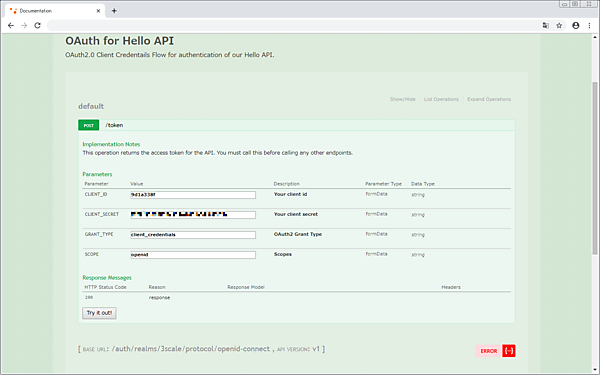 ここで、実際に開発者ポータルを用いてAPIを試し打ちしてみましょう。各APIをクリックすると、リクエストに必要なパラメータを入力できる欄が表示されます(図33)。クライアントIDとクライアントシークレットの欄には、開発者が持つクライアントアプリケーションのクライアントIDとクライアントシークレットを入力させても良いのですが、API仕様は広く一般に公開することも考えられるので、テスト用のクライアントアプリケーションを作成し、そのクライアントIDとクライアントシークレットをデフォルト値として入れておくのが親切でしょう。