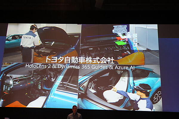 平野氏は日本のDXとして、トヨタ自動車の事例を紹介した。2019年内にHoloLens 2を導入して、全国の販売店に展開し、自動車の修理、保守点検作業に役立てるという。そのほか、HoloLensのためのDynamics 365 Guidesの採用を検討。さらに、AzureのAIサービスの検証もしているという。