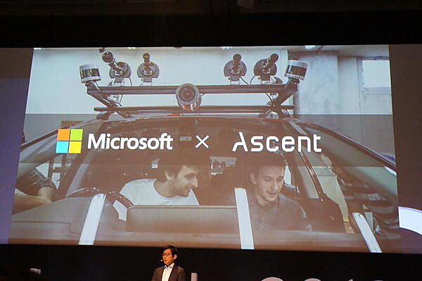 ここで、完全自動運転車を開発するアセントロボティクス株式会社 社長の石﨑雅之氏が登場。2016年に創立し、従業員91名のうち80%が技術者だという。石崎氏は「アセントロボティクスは、脳に近いしくみで認知するAIを開発している」と語った。そのためのアプローチは3つ。1つめは、仮想空間でシミュレーション可能な状況を自在に作り、AIをトレーニングすること。2つめは機械学習。3つめは運転操作がどのようにされたかをトレースできる説明可能性だ。「それをサポートするためのインフラとして、Azureを検討している」と石崎氏。平野氏がAzueを選んだ理由を尋ねると、石崎氏は「AIサービスのラインナップが揃っている」ことを挙げた。なお、その後6月に正式に日本マイクロソフトとの協業を発表している。