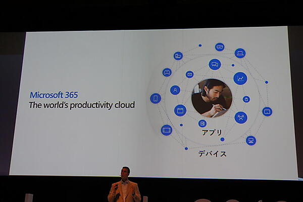 スパタロウ氏は、世の中もビジネスも指数関数的な変化が起きており、それに伴って働き方も進化して生産性を上げる必要があると語った。そして、Microsoftは複数のイノベーションを統合して生産性のために何ができるかを考える時期にきていると述べた。これまでのMicrosoftの歴史を振り返ると、まず70年代後半から80年代初頭は職人のようにアプリの使い方を学ぶ時代だった。その後、デバイスが中心になり、世界中の人がスマートフォンを毎日持ち歩いている時代になった。そのうえでスパタロウ氏が新しく考える時期が「第三の波」だ。中心に人があり、その周囲に人を助けるためのアプリやデバイスが存在する。「パラダイムシフトにより、人に焦点を当てる、世界一の生産性のためのツールがMicrosoft 365だ」と説明した。