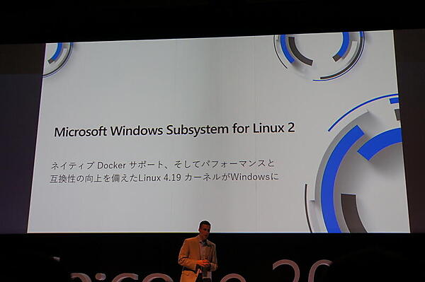 次は、Microsoft Windows Subsystem for Linux (WSL) 2。2017年に正式版となった従来のWSL(WSL 1)はWindowsカーネルがLinuxカーネルをエミュレートしたものだったが、WSL 2では軽量ハイパーバイザーでフルのLinux 4.19カーネルが動く。壇上では、WSL 2のLinuxでVS Codeが動いているところなどが示された。また、JavaScriptのパッケージをインストールをインストールするnpm installコマンドをWSL 2とWSL 1で実行し、4.4秒と31秒という大差がつくというI/Oパフォーマンスを見せた。