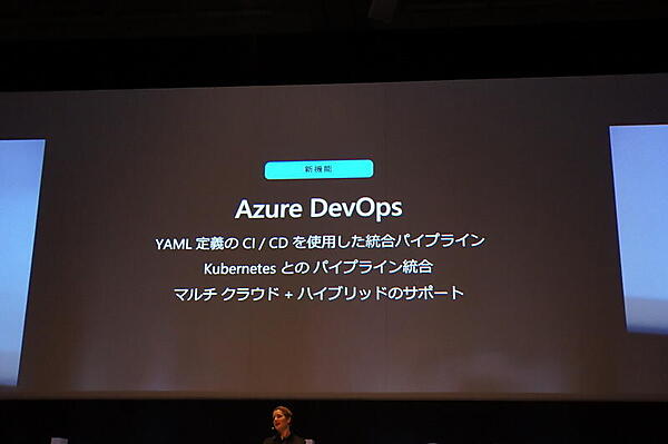 続いて、ホワイト氏は2018年のGitHub買収について言及。3600万以上の開発者が利用しており、CI/CDなどのDevOpsと組み合わせて使われることも多い。ホワイト氏は、GitHubとAzure DevOps(旧名Visual Studio Team Services)の組み合わせとして、Azure PipelinesでCI/CDを実行する例を紹介した。そのAzure DevOpsの新機能として、ホワイト氏はYAML定義のCI/CDを使用した統合パイプラインや、Kubernetesとのパイプライン統合、マルチクラウド+ハイブリッドクラウドのサポートを紹介した。